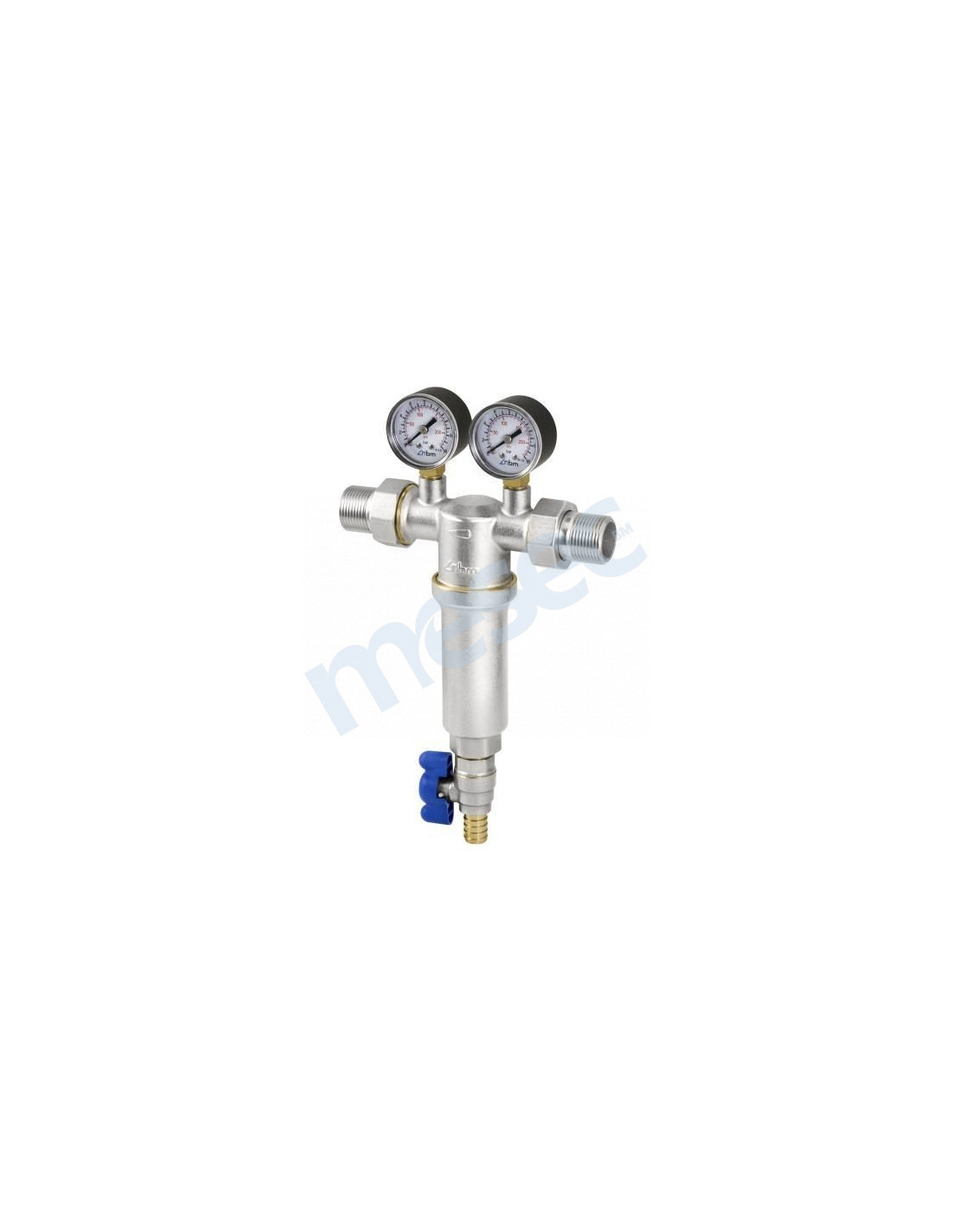 Samočistilni filter z zamenljivo nerjavno filtrirno kartušo, manometri za vizualni prikaz zamašenosti filtrirne kartuše in vgrajenim izpustom za ispiranje filtra.